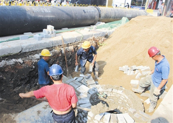 下午1時,記者來到關(guān)橋附近的一處施工現(xiàn)場,這里正在進(jìn)行的是管道焊接。明晃晃的太陽炙烤著水泥地面,即使站著不動,依然覺得雙腿被灼得慌,汗?jié)n透過衣服清晰可見,但在僅有一米寬左右的工作區(qū)內(nèi),工作人員穿著厚厚的服裝,忙著焊接、擰螺絲。“這里是交通要道,上下班時間,車流量太大,有些工作不好開展,只能趁著中午加班!惫こ滩繖C修班班長夏海峰解釋道。