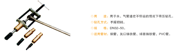 手動不停水打孔機(jī)在建設(shè)、鋪設(shè)管道中,分支管道嫁接管道成為必不可少的工作,而對于各類材質(zhì)的管道進(jìn)行開孔則是首要問題,聊城市鴻福管業(yè)有限公司生產(chǎn)的手動不停水打孔機(jī)可以適用于國標(biāo)球鐵管、球墨管、水泥管、塑料管等材質(zhì)的管道,為管道建設(shè)作出了應(yīng)有的貢獻(xiàn)。手動不停水打孔機(jī)開孔器主要是用于供水、煤氣、石油、化工等各種規(guī)格主管道的嫁接分支管道作業(yè)。